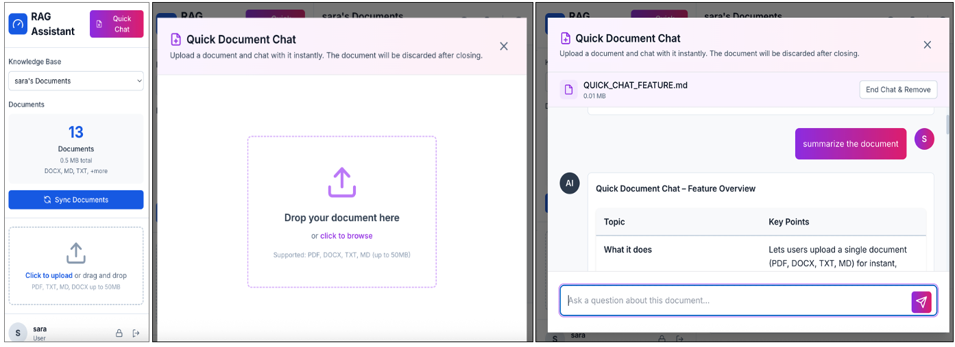 - Quick Document Chat (new): Upload any single document for instant one-time analysis without adding it to your knowledge base. Great for temporary reviews, quick fact-checking, or testing documents before permanent storage. Documents will not be stored in the knowledge base.