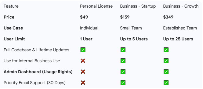 2. What's the difference in the code between the Personal and Business licenses? You receive the same, complete codebase regardless of which license you purchase. This ensures that all users can receive updates easily. The license you buy determines your usage rights. The Personal License is for individual, non-commercial use, while the Team / Business License grants you the right to deploy the application for internal business use and use team management features like the admin dashboard.